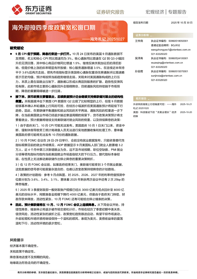 东方证券-海外札记:海外迎接四季度政策宽松窗口期-251030