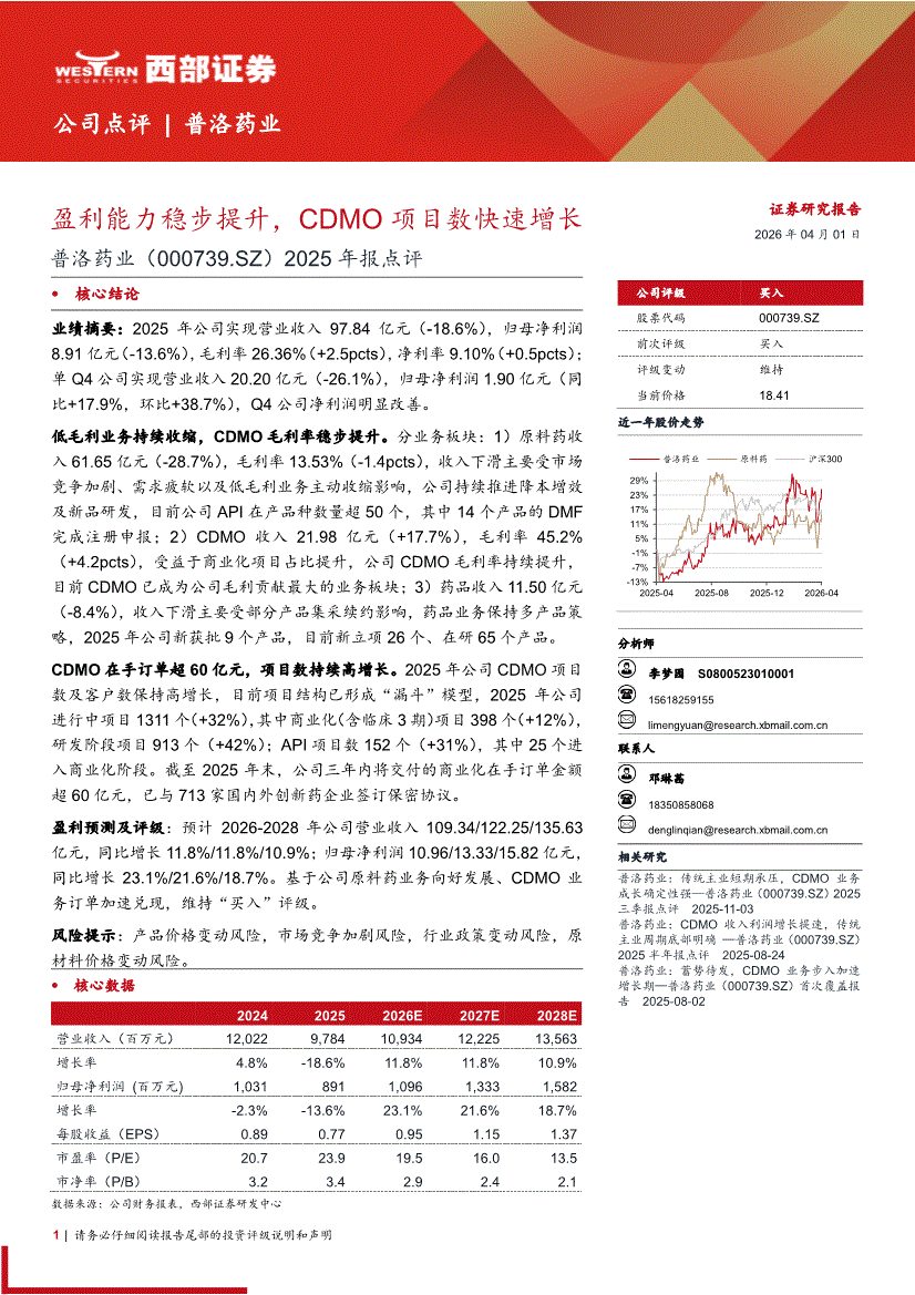 普洛药业:西部证券-普洛药业-000739-2025年报点评:盈利能力稳步提升,CDMO项目数快速增长-260401