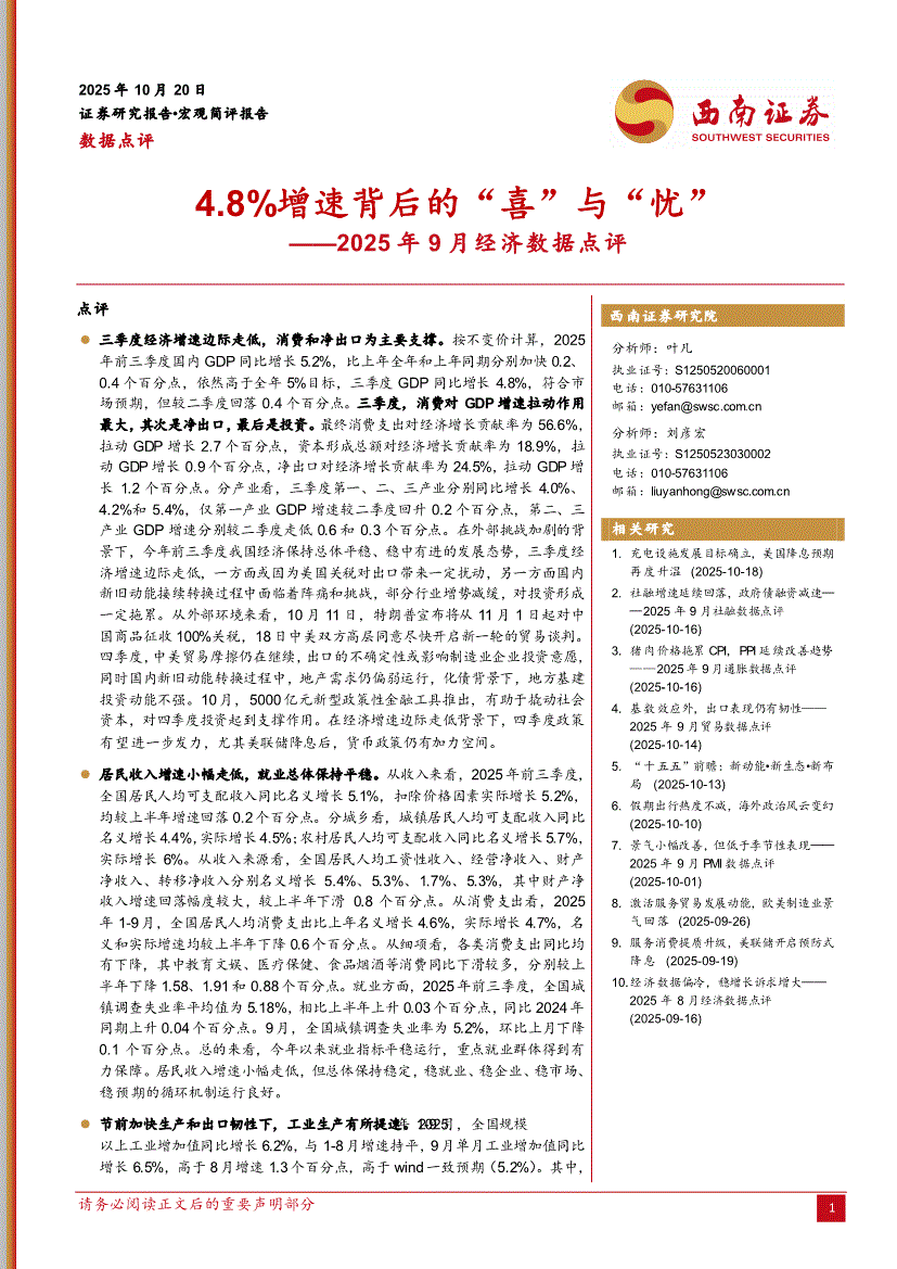 西南证券-2025年9月经济数据点评:4.8%增速背后的“喜”与“忧”-251020