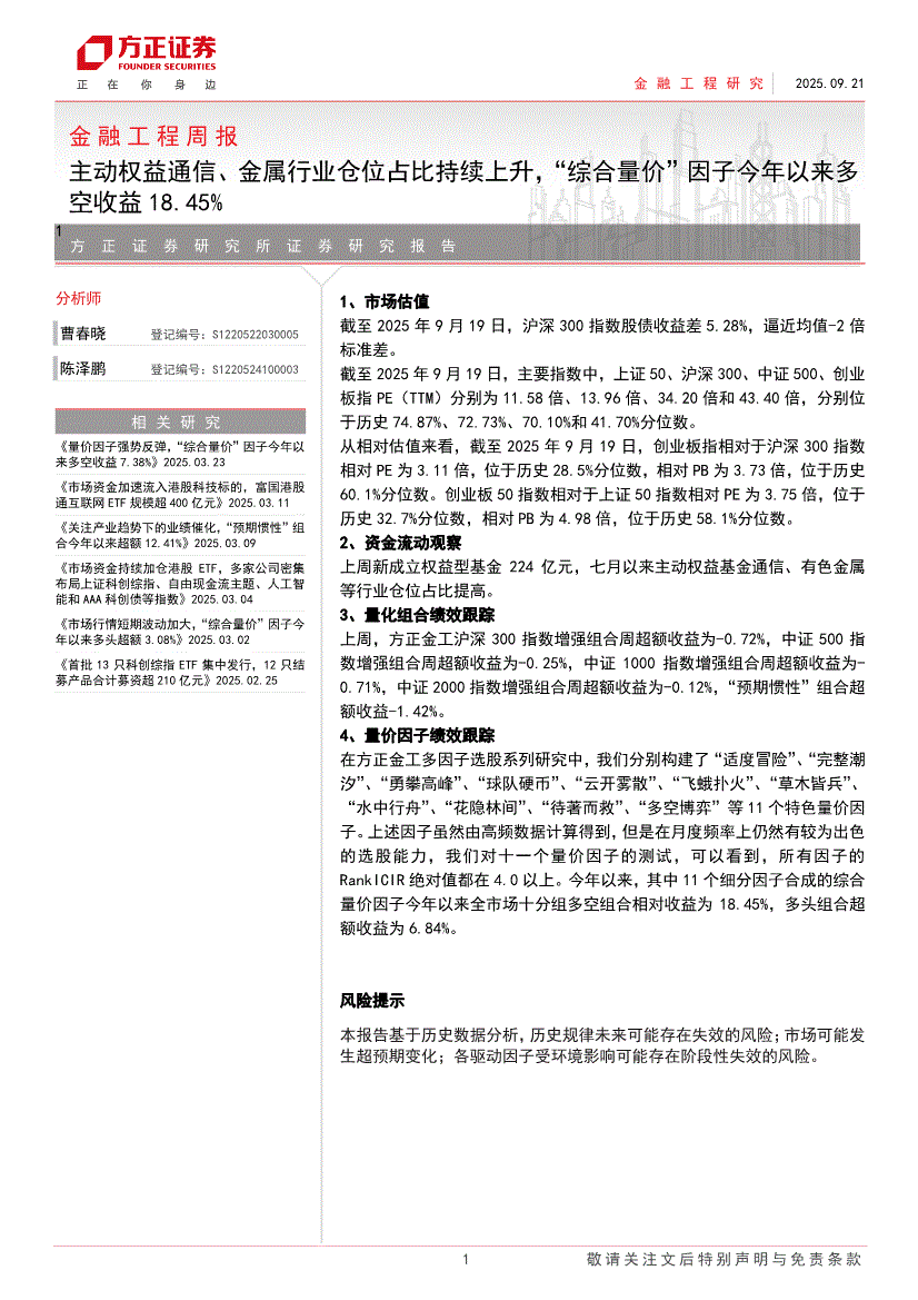 方正证券-金融工程周报:主动权益通信、金属行业仓位占比持续上升,“综合量价”因子今年以来多空收益18.45%-250921