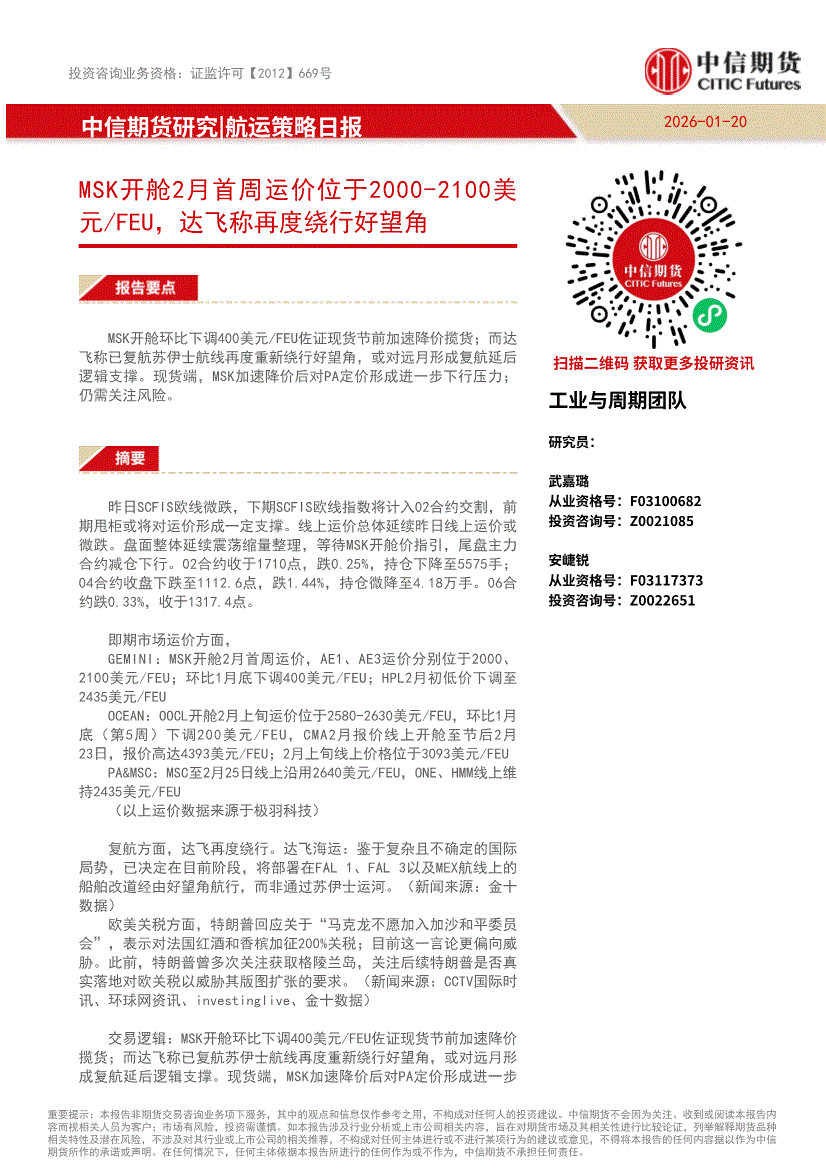 中信期货-航运策略日报:MSK开舱2月首周运价位于2000~2100美元/FEU,达飞称再度绕行好望角-260120