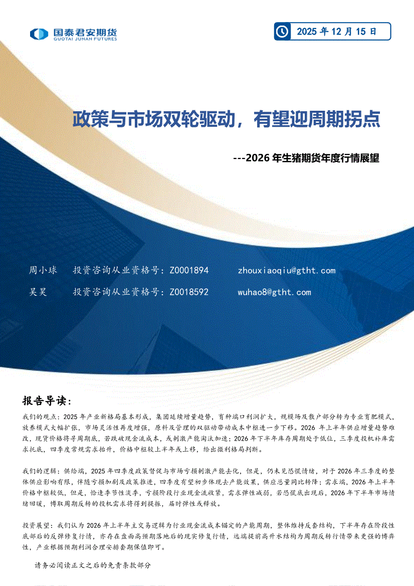 国泰君安期货-2026年生猪期货年度行情展望:政策与市场双轮驱动,有望迎周期拐点-251215