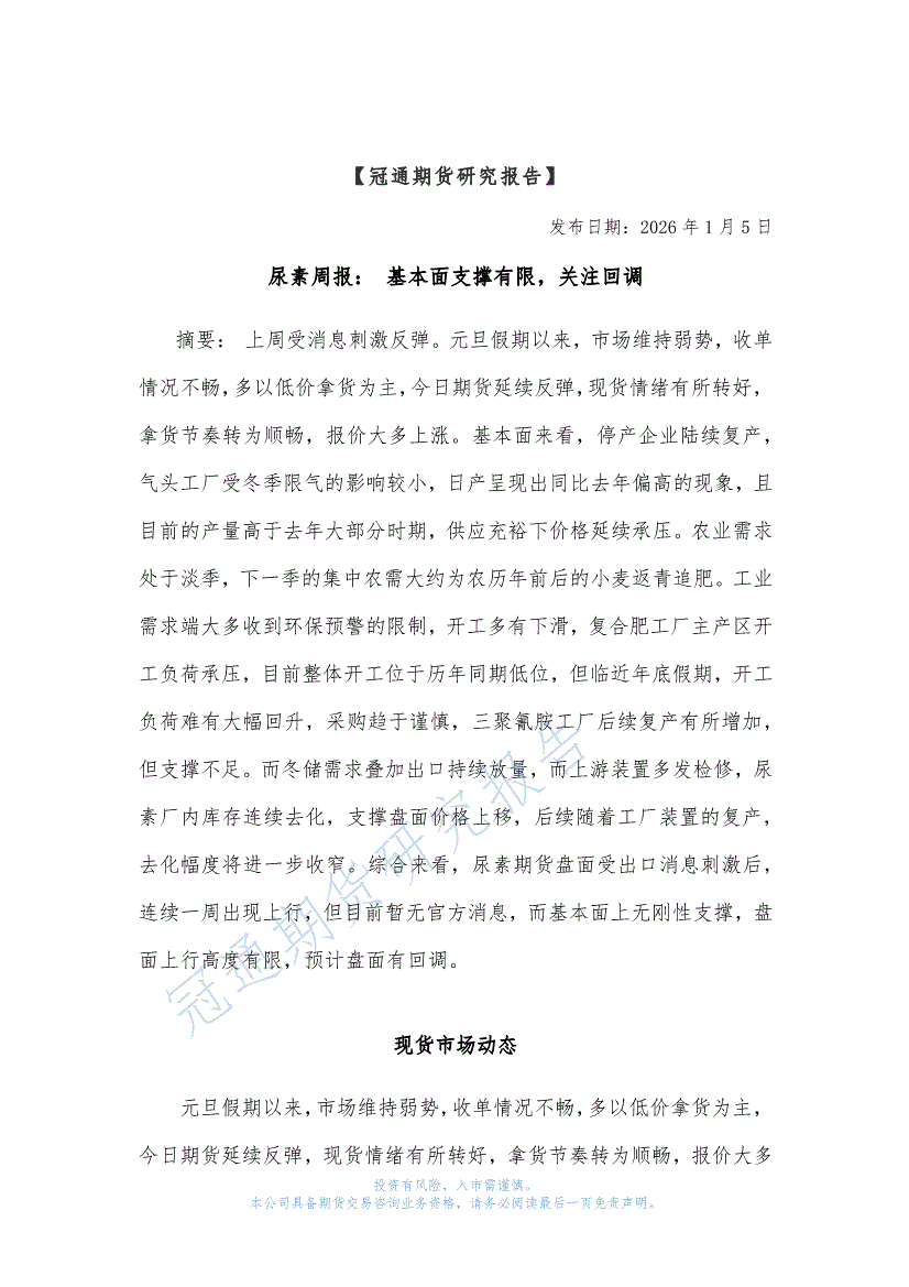 冠通期货-尿素周报:基本面支撑有限,关注回调-260105