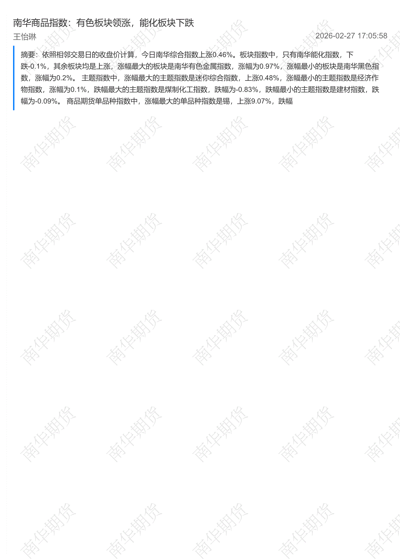 南华期货-商品指数:有色板块领涨,能化板块下跌-260227