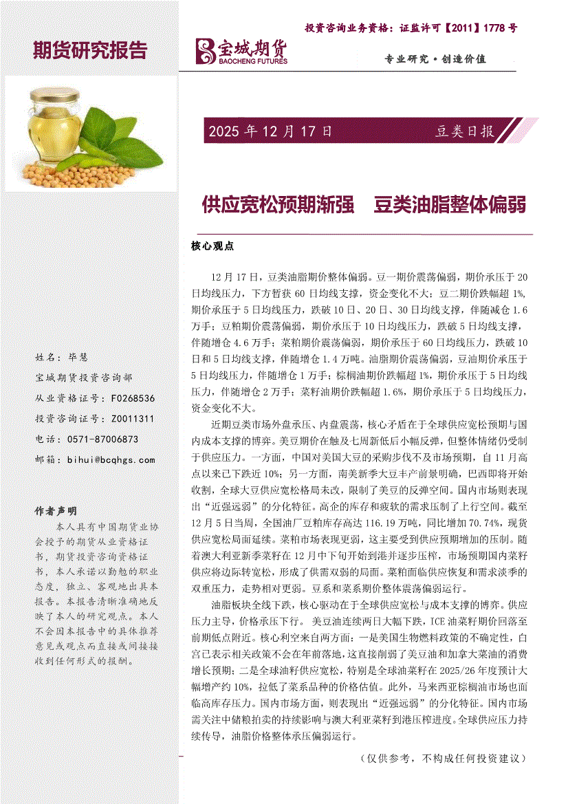 宝城期货-豆类日报:供应宽松预期渐强,豆类油脂整体偏弱-251217
