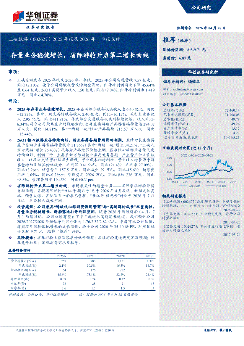 三峡旅游:华创证券-三峡旅游-002627-2025年报及2026年一季报点评:存量业务稳健增长,省际游轮开启第二增长曲线-260428