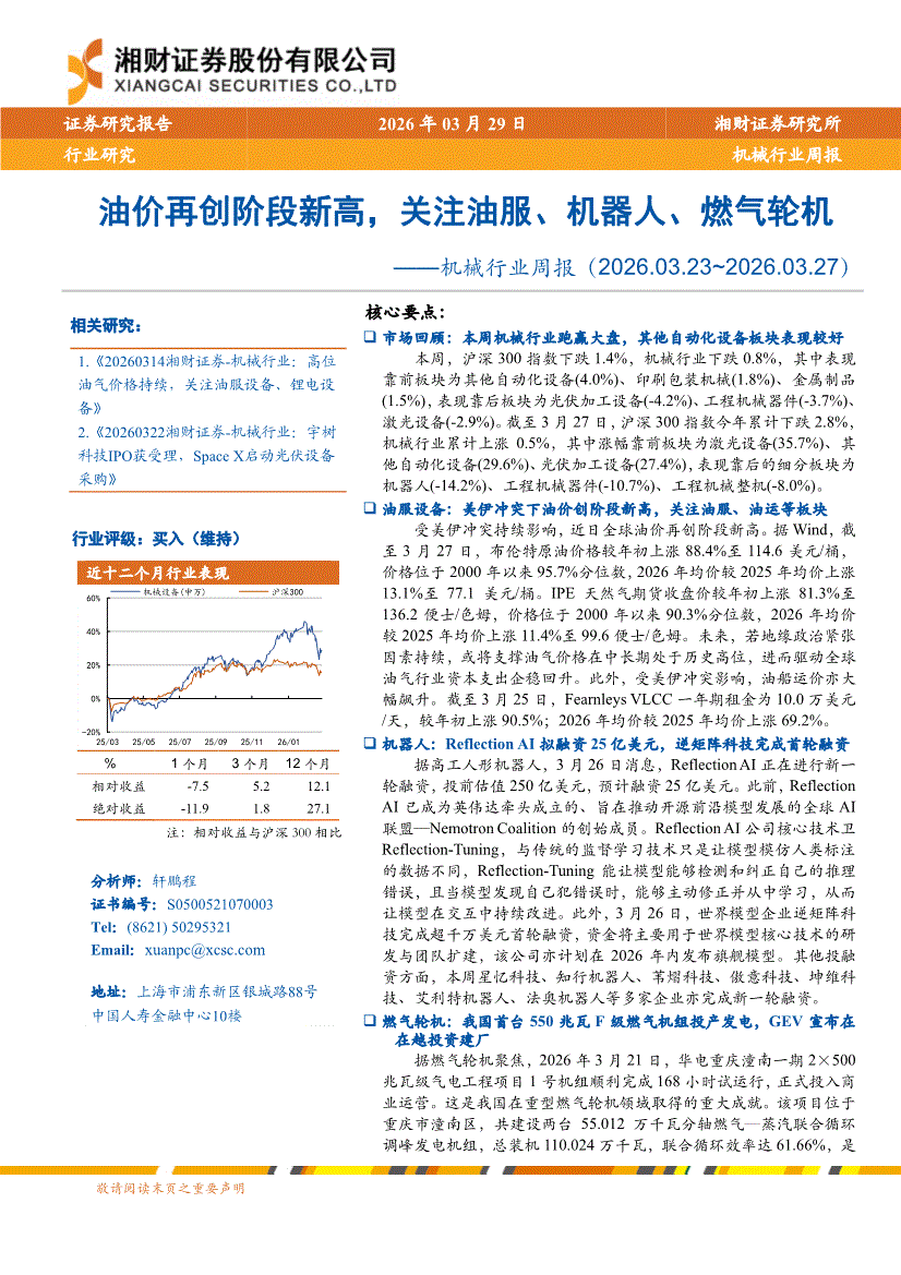 机械行业:湘财证券-机械行业周报:油价再创阶段新高,关注油服、机器人、燃气轮机-260329
