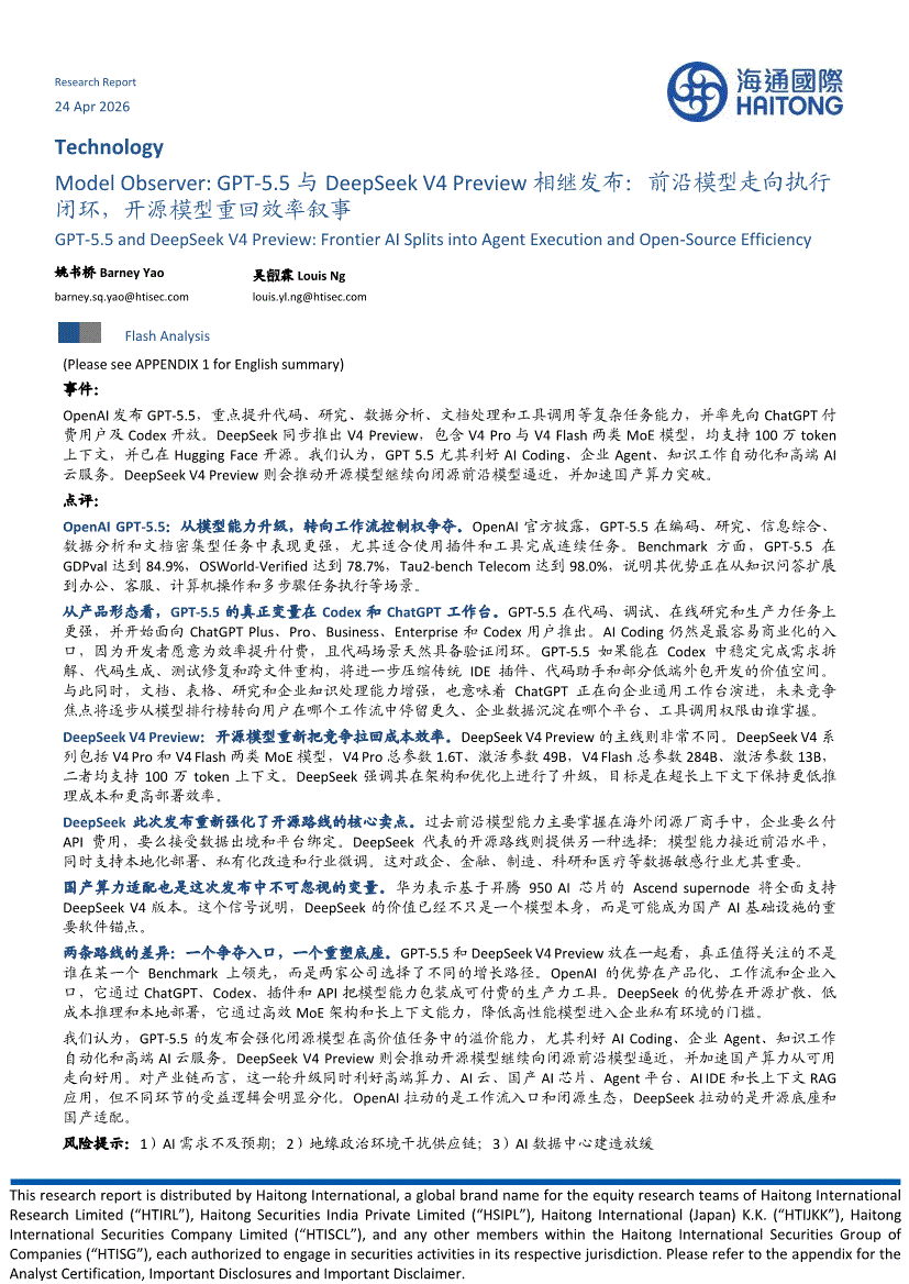 计算机行业:海通国际-计算机行业:Model Observer,GPT~5.5与DeepSeek V4 Preview相继发布,前沿模型走向执行闭环,开源模型重回效率叙事-260424
