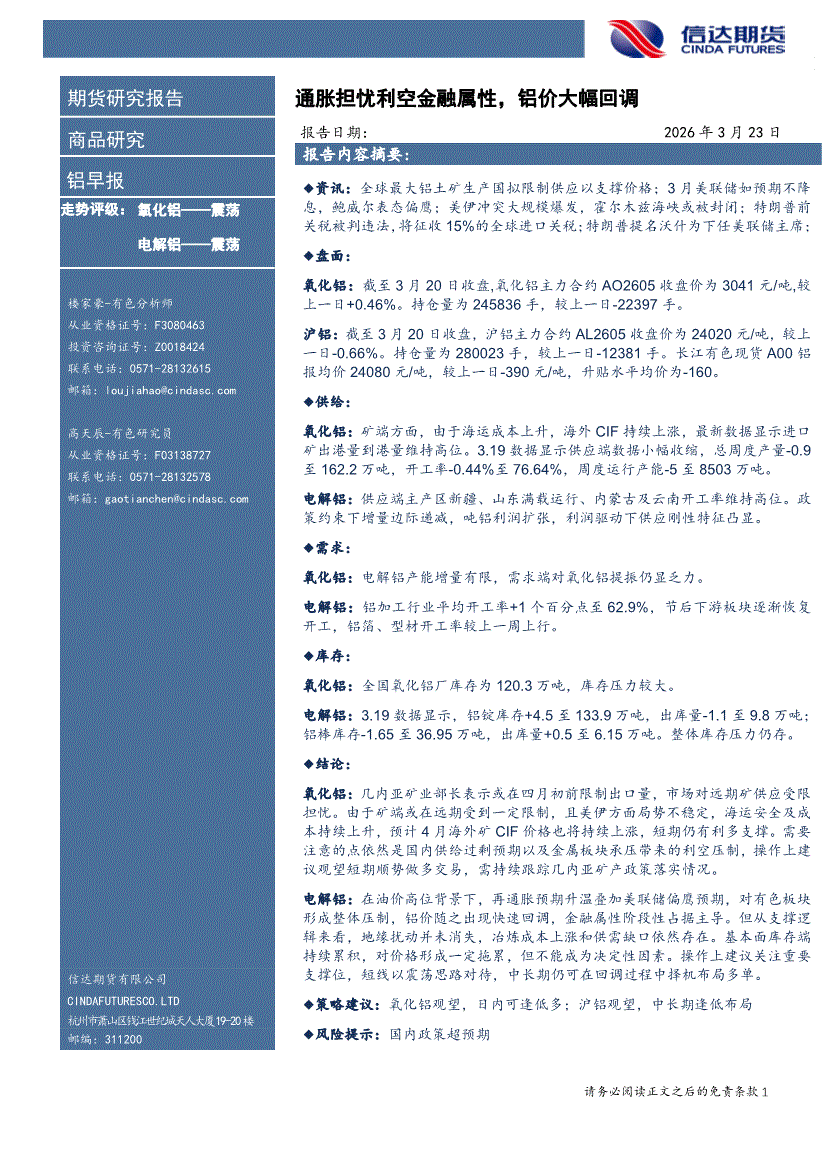 信达期货-铝早报:通胀担忧利空金融属性,铝价大幅回调-260323