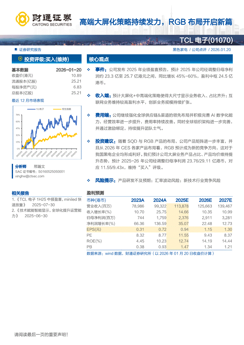 TCL电子:财通证券-TCL电子-1070.HK-高端大屏化策略持续发力,RGB布局开启新篇-260120