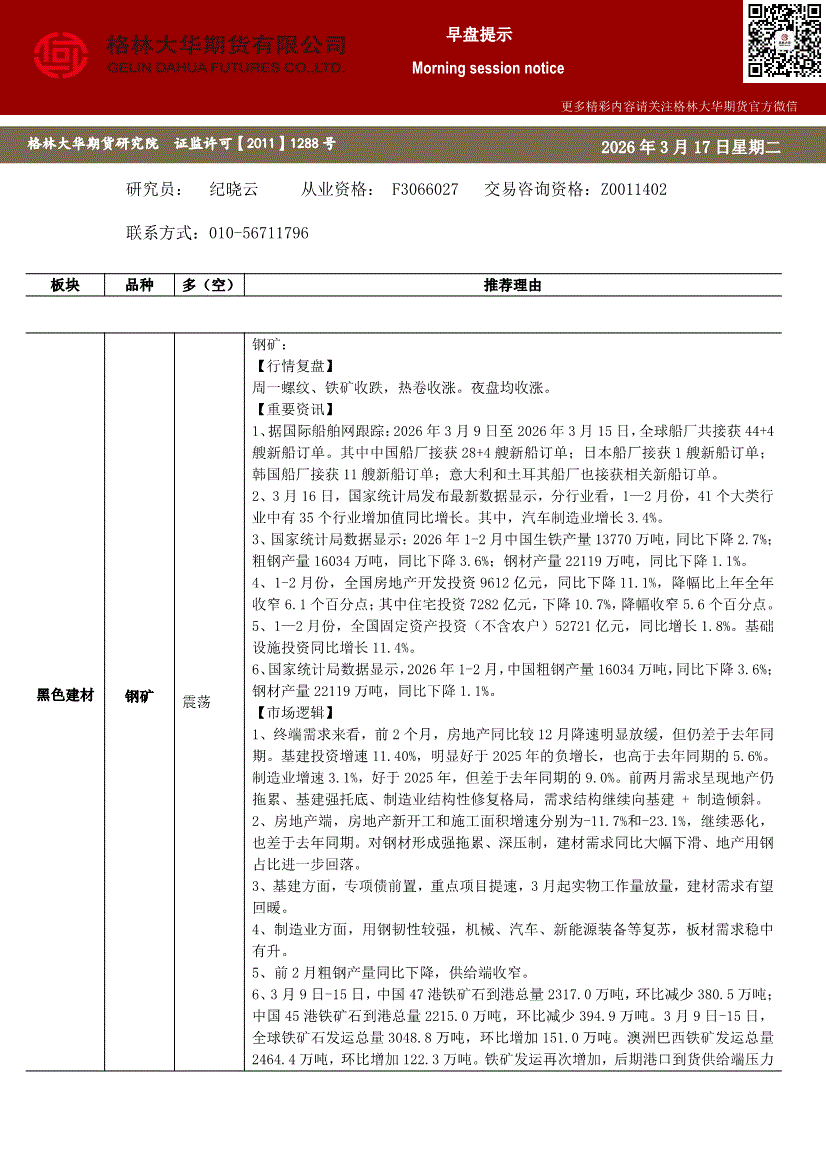 格林大华期货-一周简评:钢矿关注需求预期与现实博弈,关注跨品种套利机会-260313