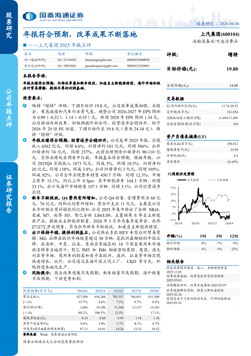 上汽集团:国泰海通证券-上汽集团-600104-2025年报点评:年报符合预期,改革成果不断落地-260406