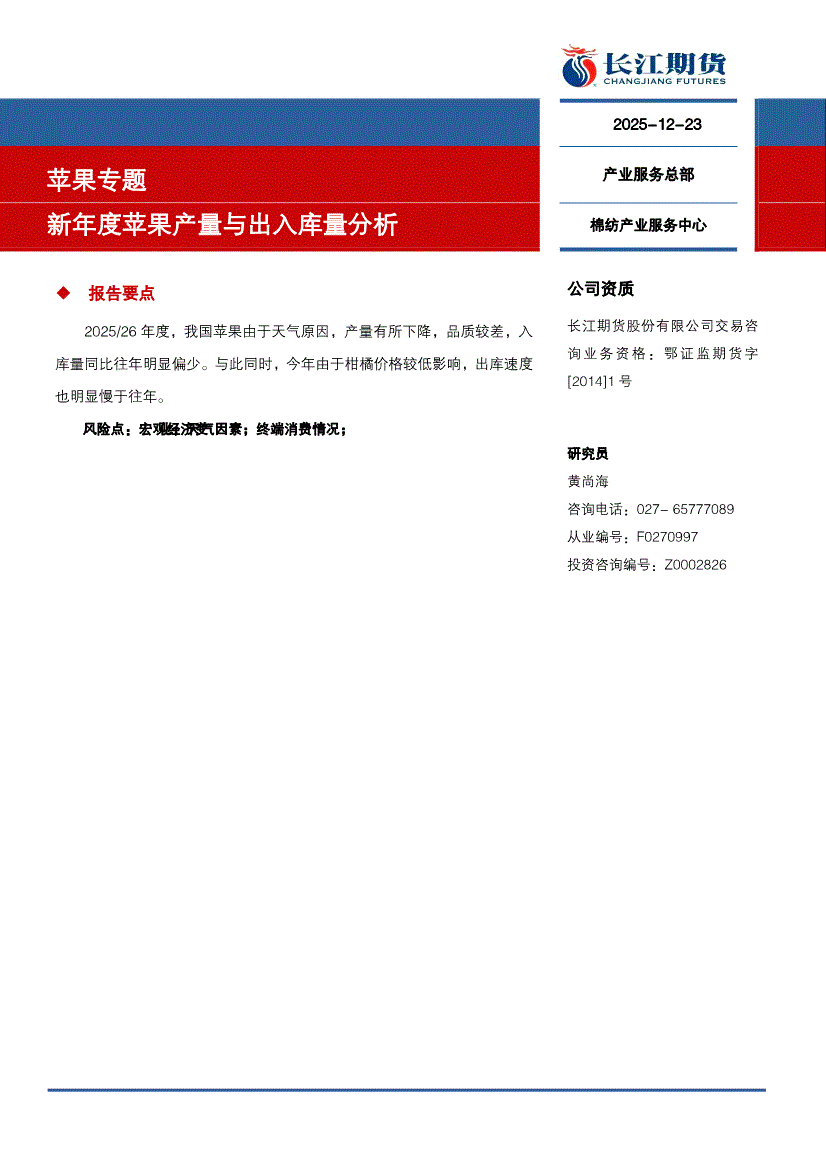 长江期货-苹果专题:新年度苹果产量与出入库量分析-251223