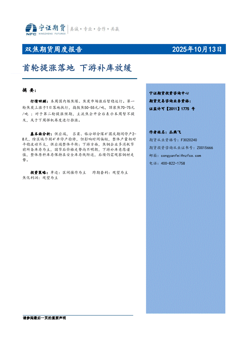宁证期货-双焦期货周度报告:首轮提涨落地,下游补库放缓-251013