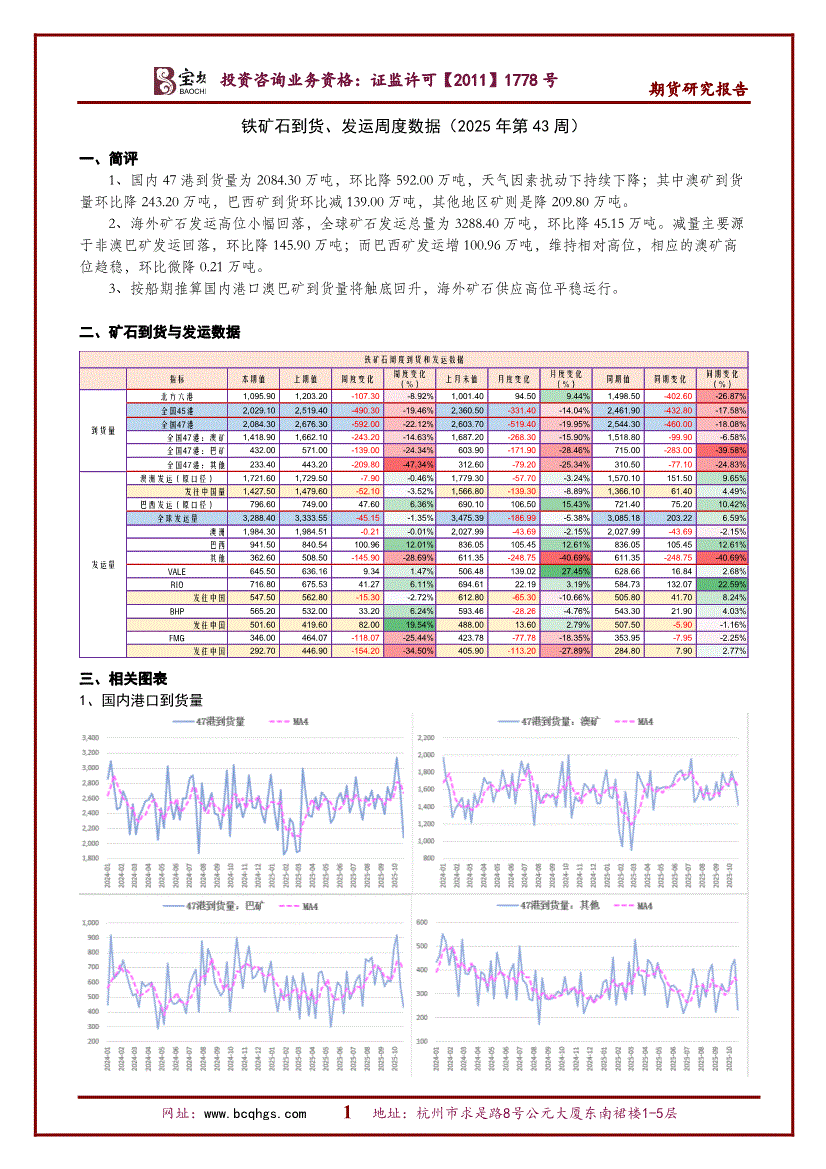 宝城期货-铁矿石到货、发运周度数据(2025年第43周)-251027