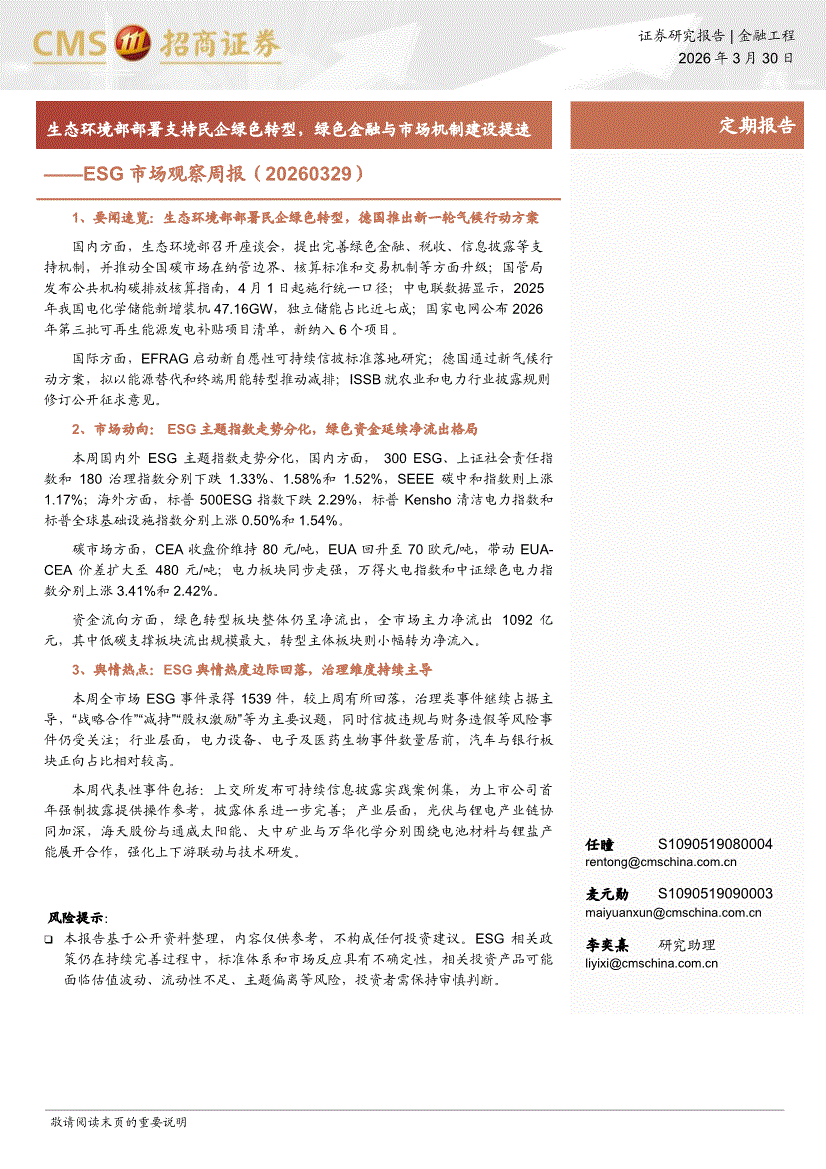 招商证券-ESG市场观察周报:生态环境部部署支持民企绿色转型,绿色金融与市场机制建设提速-260330