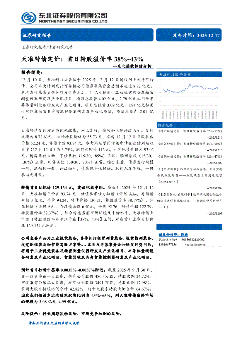 东北证券-东北固收转债分析:天准转债定价,首日转股溢价率38%~43%-251217