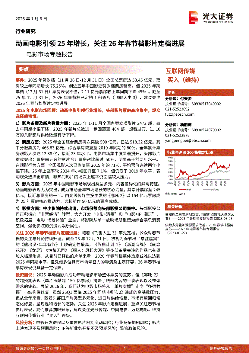 互联网传媒行业:光大证券-互联网传媒行业电影市场专题报告:动画电影引领25年增长,关注26年春节档影片定档进展-260106