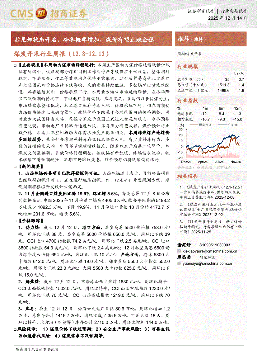 煤炭开采行业:招商证券-煤炭开采行业周报:拉尼娜状态开启,冷冬概率增加,煤价有望止跌企稳-251214