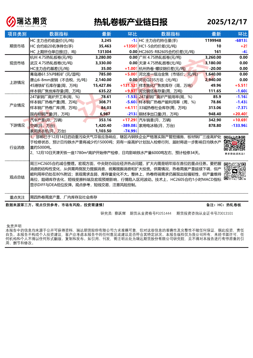瑞达期货-热轧卷板产业链日报-251217