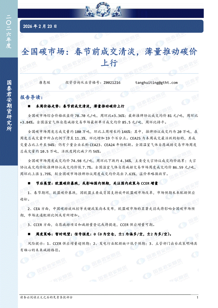 国泰君安期货-全国碳市场:春节前成交清淡,薄量推动碳价上行-260223