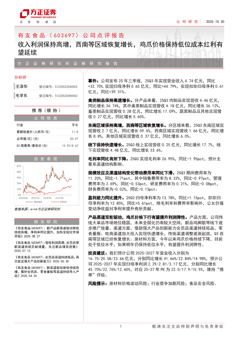 有友食品:方正证券-有友食品-603697-公司点评报告:收入利润保持高增,西南等区域恢复增长,鸡爪价格保持低位成本红利有望延续-251030