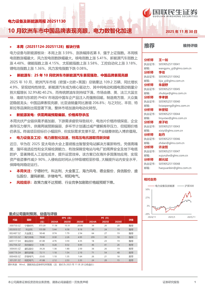 电力设备及新能源行业:国联民生证券-电力设备及新能源行业周报:10月欧洲车市中国品牌表现亮眼,电力数智化加速-251130