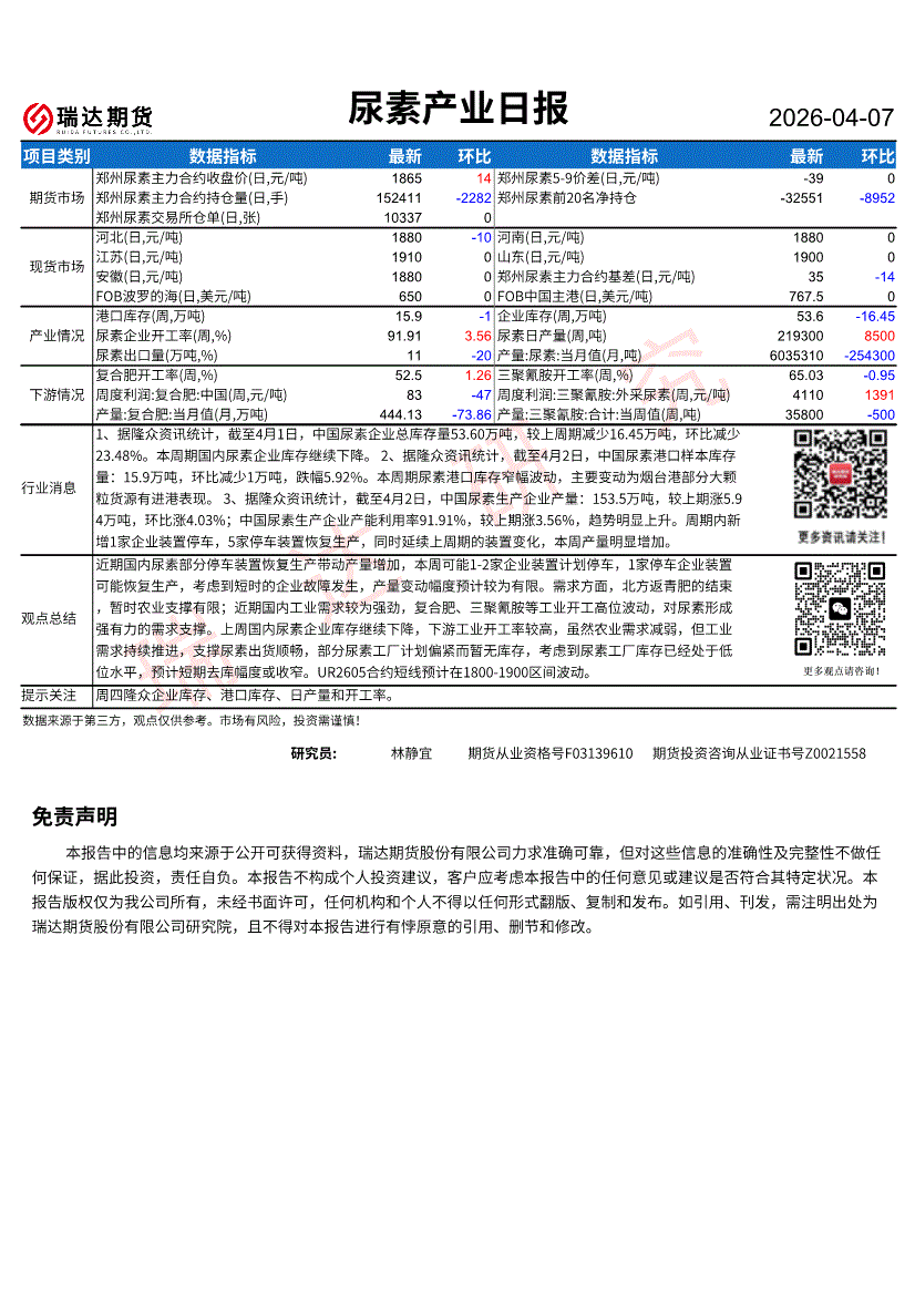 瑞达期货-尿素产业日报-260407