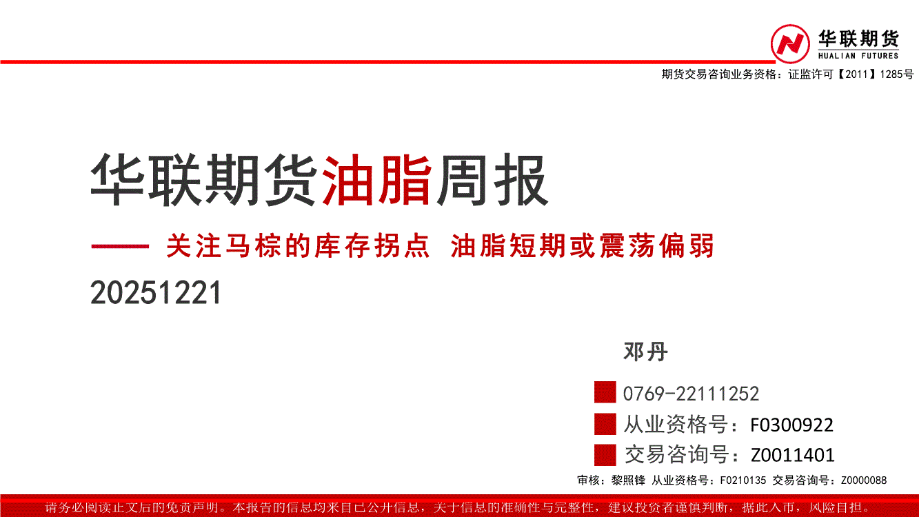 华联期货-油脂周报:关注马棕的库存拐点,油脂短期或震荡偏弱-251221