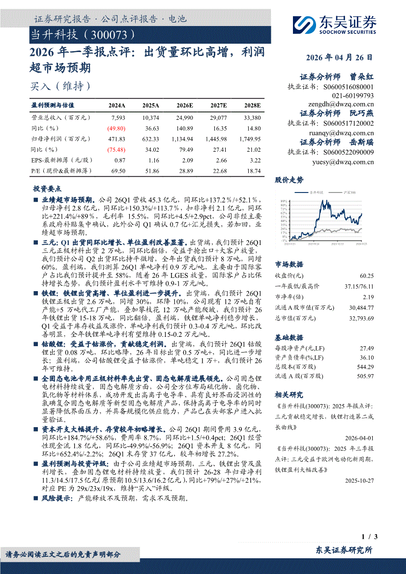 当升科技:东吴证券-当升科技-300073-2026年一季报点评:出货量环比高增,利润超市场预期-260426