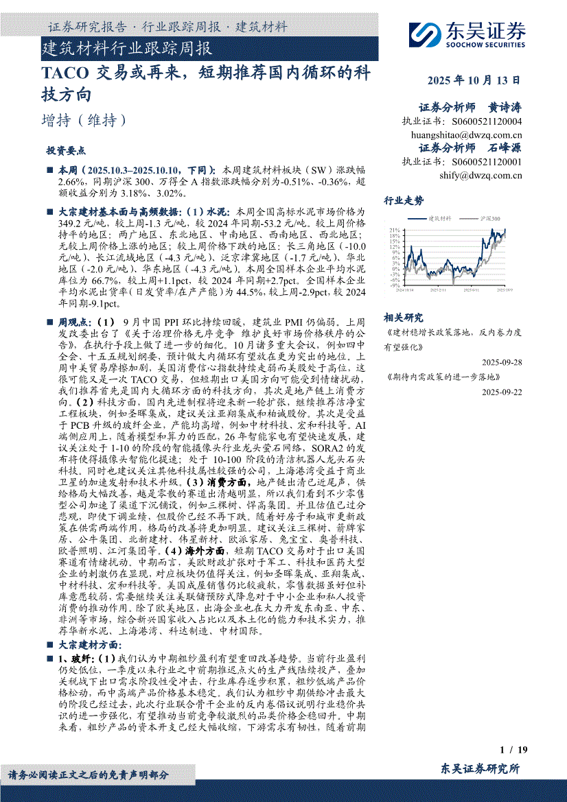 建筑材料行业:东吴证券-建筑材料行业跟踪周报:TACO交易或再来,短期推荐国内循环的科技方向-251013