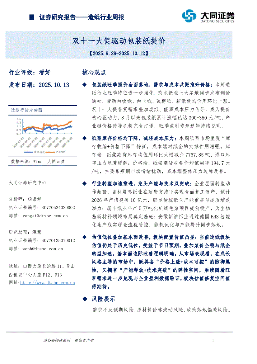 造纸行业:大同证券-造纸行业周报:双十一大促驱动包装纸提价-251013