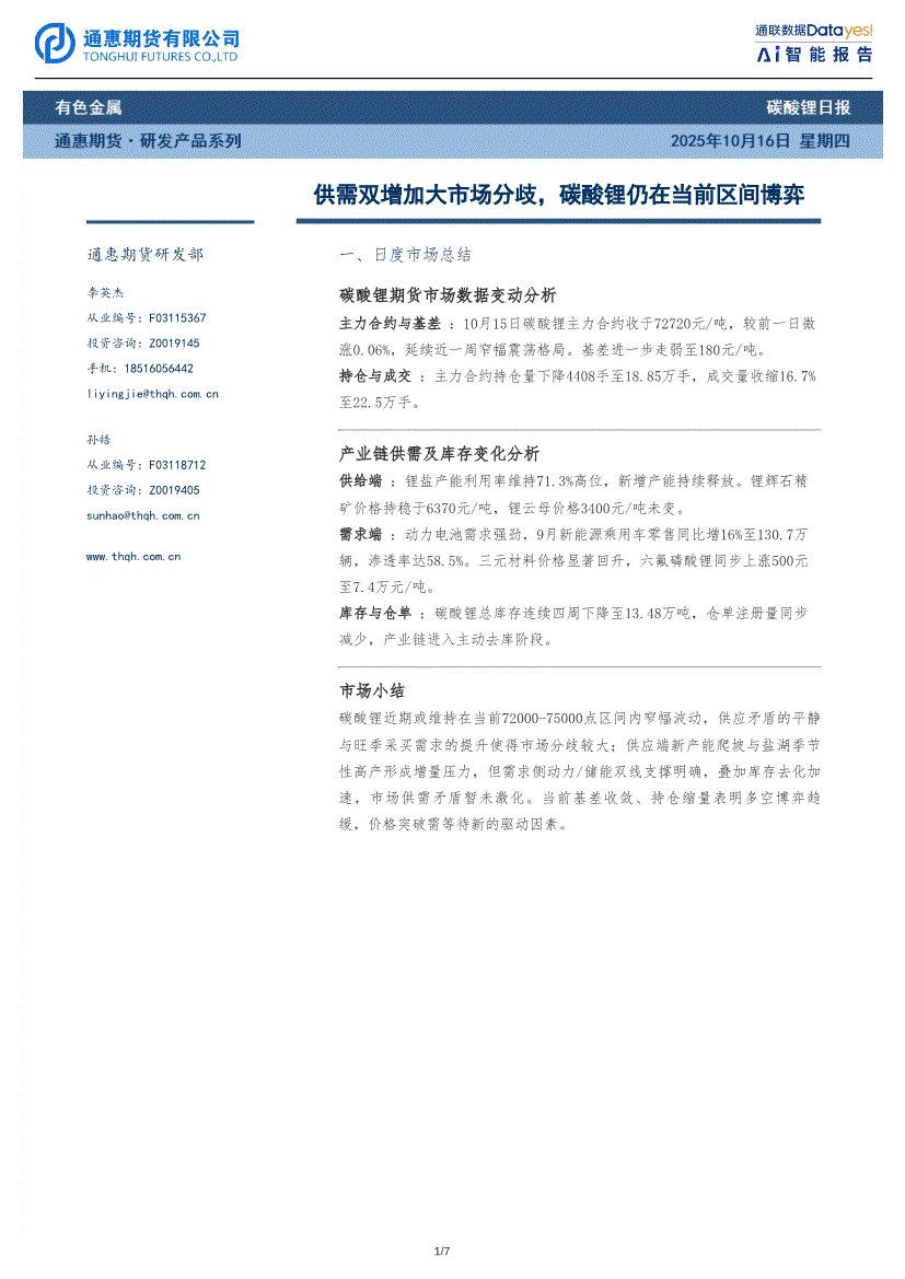通惠期货-碳酸锂日报:供需双增加大市场分歧,碳酸锂仍在当前区间博弈-251016