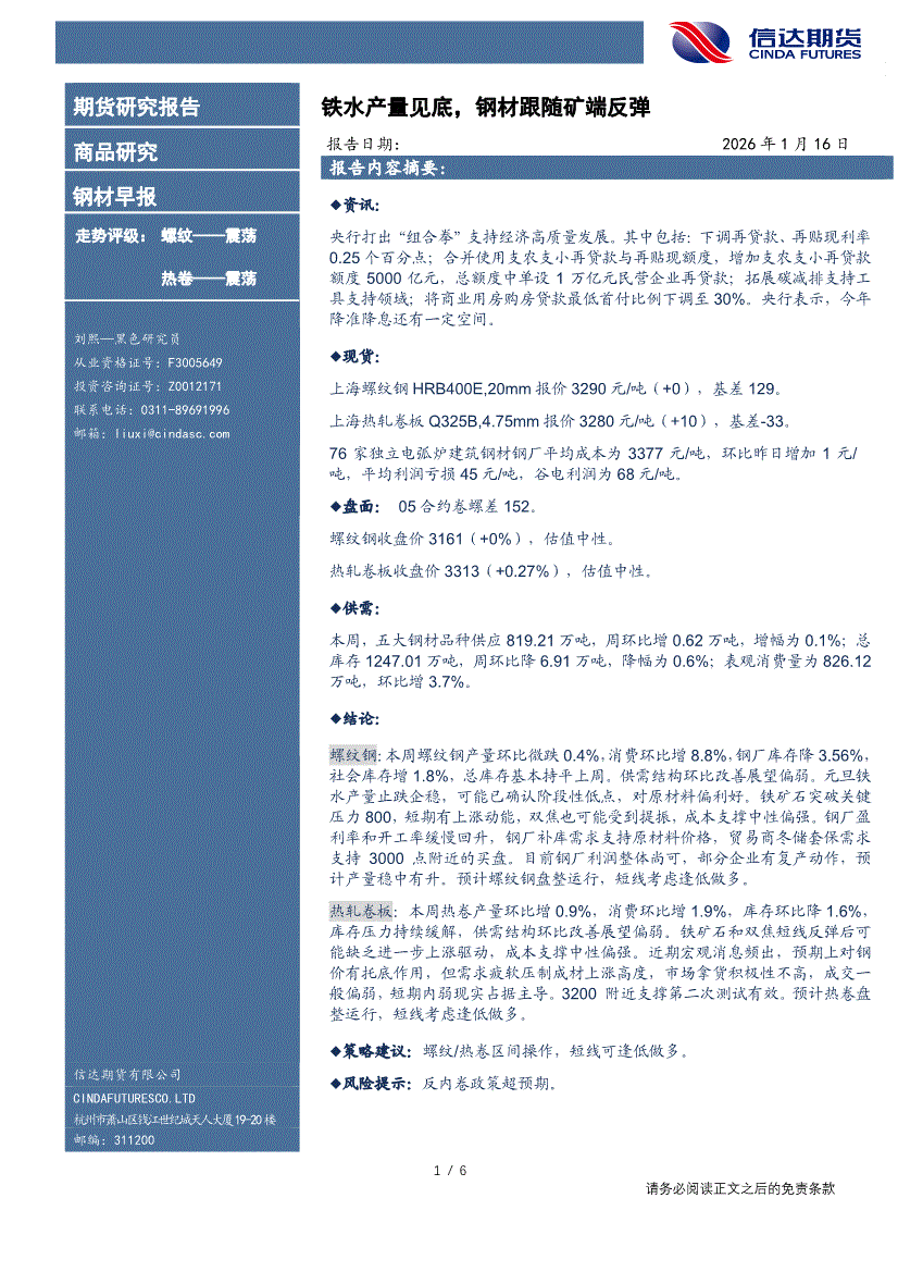 信达期货-钢材早报:铁水产量见底,钢材跟随矿端反弹-260116