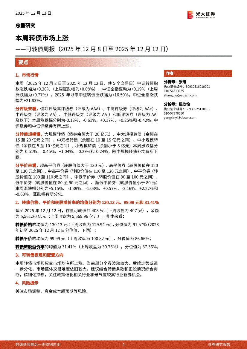 光大证券-可转债周报(2025年12月8日至2025年12月12日):本周转债市场上涨-251213