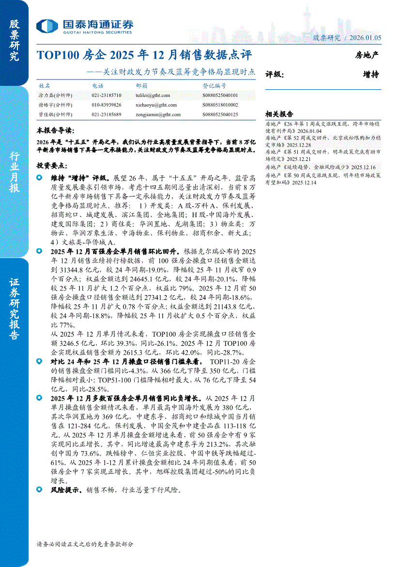 房地产行业:国泰海通证券-房地产行业关注财政发力节奏及蓝筹竞争格局显现时点:TOP100房企2025年12月销售数据点评-260105
