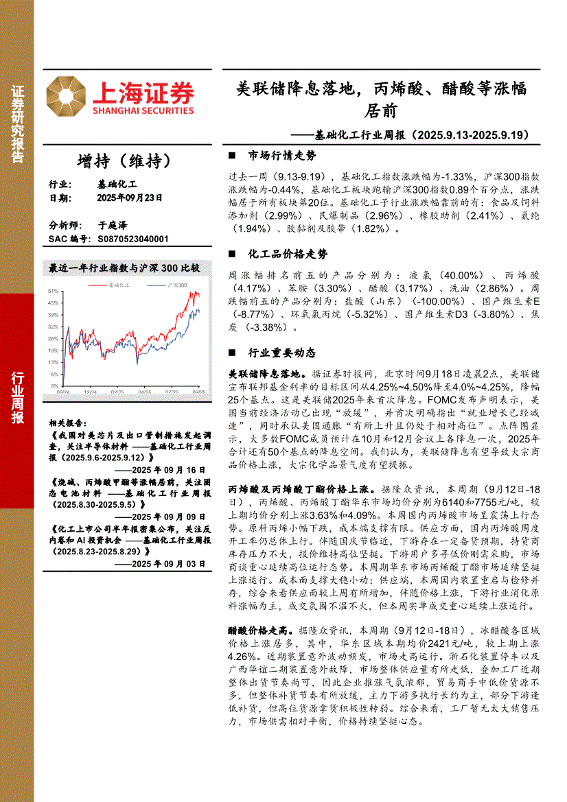 基础化工行业:上海证券-基础化工行业周报:美联储降息落地,丙烯酸、醋酸等涨幅居前-250923