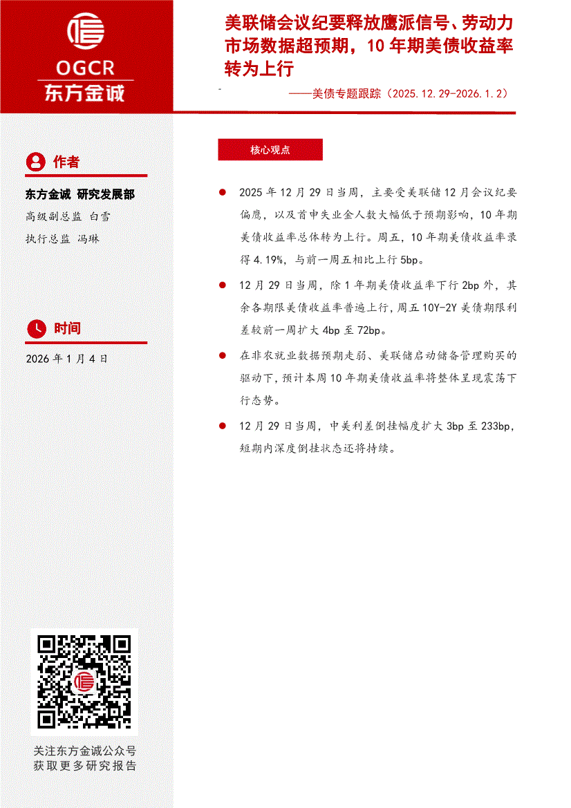 东方金诚-美债专题跟踪:美联储会议纪要释放鹰派信号、劳动力市场数据超预期,10年期美债收益率转为上行-260104