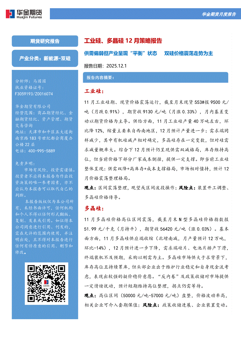 华金期货-工业硅、多晶硅12月策略报告:供需偏弱但产业呈现“平衡”状态,双硅价格震荡走势为主-251201