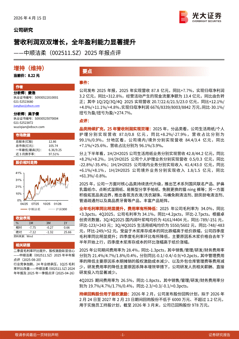中顺洁柔:光大证券-中顺洁柔-002511-2025年报点评:营收利润双双增长,全年盈利能力显著提升-260415