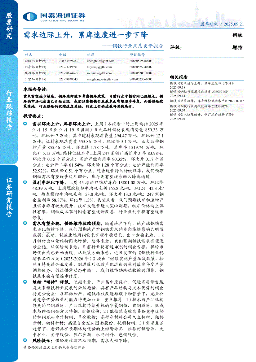 钢铁行业:国泰海通证券-钢铁行业周度更新报告:需求边际上升,累库速度进一步下降-250921