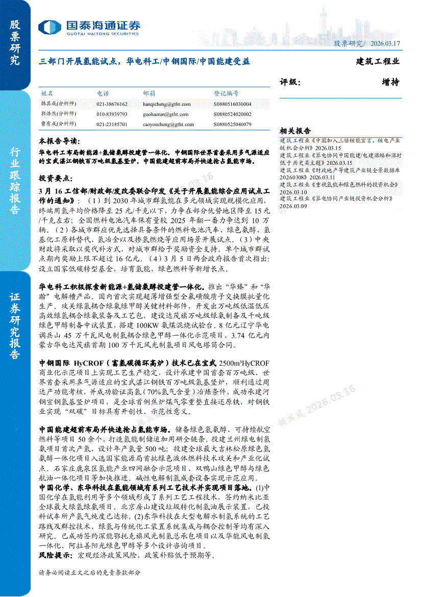建筑工程行业:国泰海通证券-建筑工程行业:三部门开展氢能试点,华电科工中钢国际中国能建受益-260317