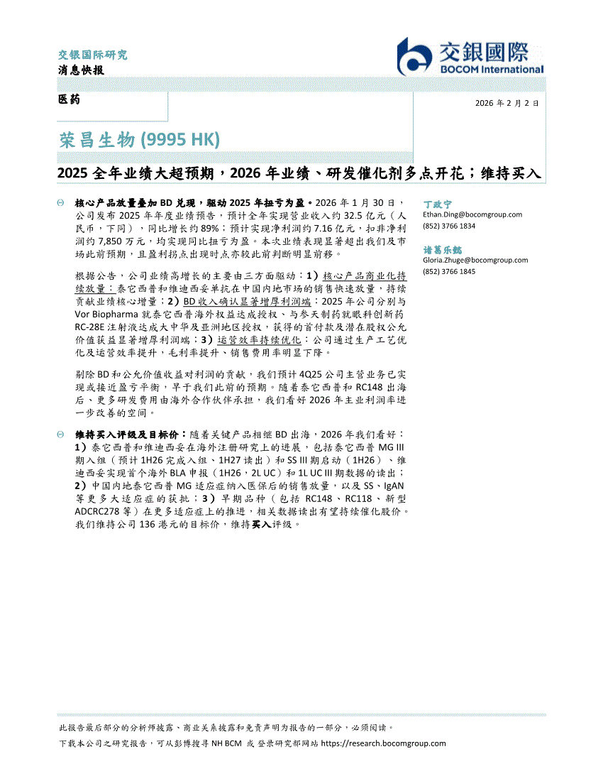 荣昌生物:交银国际-荣昌生物-9995.HK-2025全年业绩大超预期,2026年业绩、研发催化剂多点开花;维持买入-260202