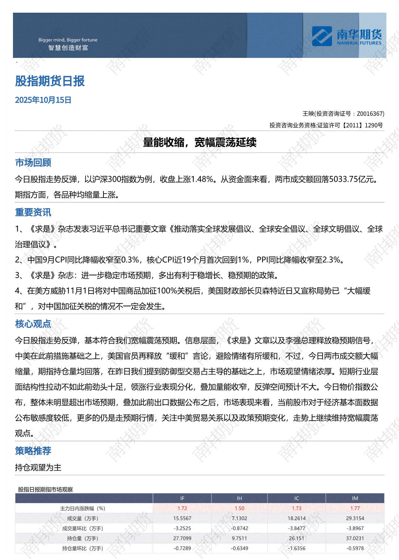 南华期货-股指日报:量能收缩,宽幅震荡延续-251015