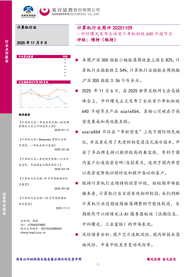 计算机行业:金元证券-计算机行业周评:中科曙光发布全球首个单机柜级640卡超节点-251109