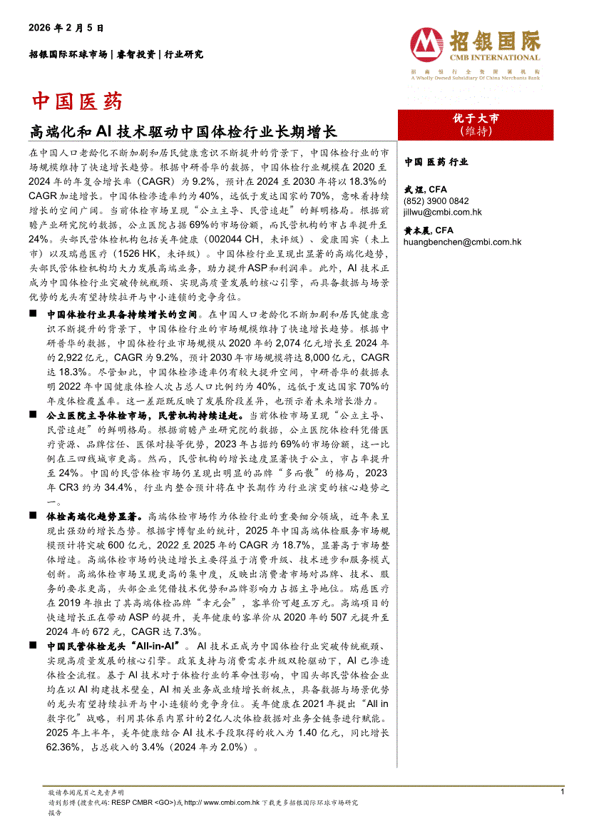 医药行业:招银国际-中国医药行业:高端化和AI技术驱动中国体检行业长期增长-260205