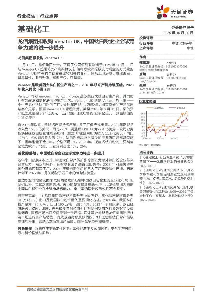 基础化工行业:天风证券-基础化工行业:龙佰集团拟收购Venator UK,中国钛白粉企业全球竞争力或将进一步提升-251020