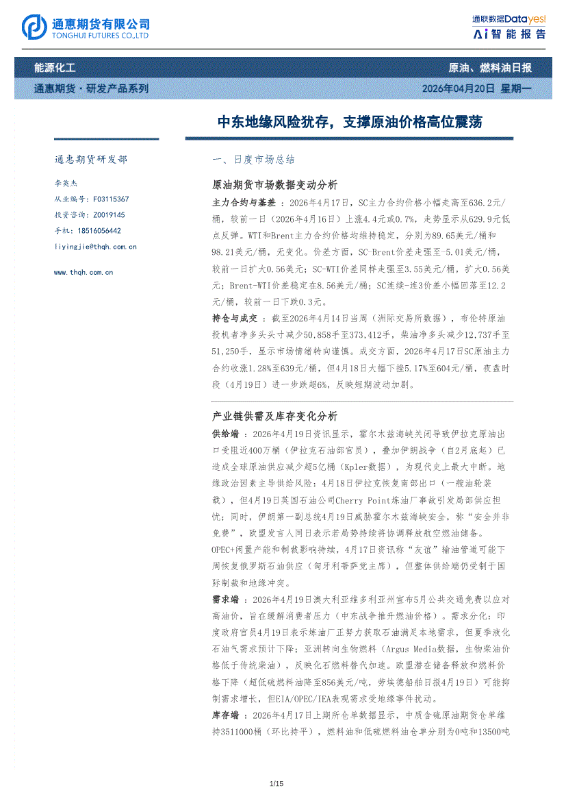 通惠期货-原油、燃料油日报:中东地缘风险犹存,支撑原油价格高位震荡-260420