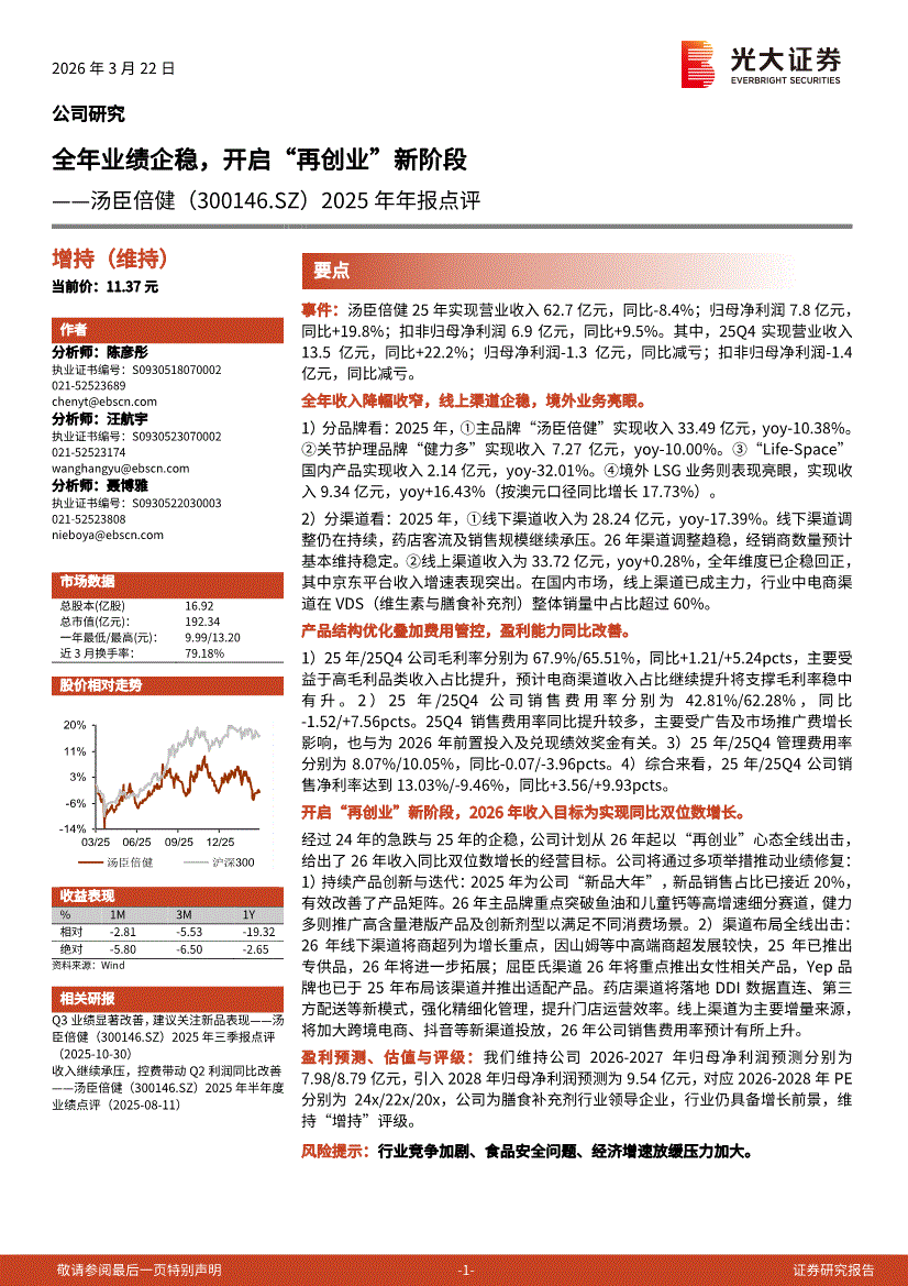 汤臣倍健:光大证券-汤臣倍健-300146-2025年年报点评:全年业绩企稳,开启“再创业”新阶段-260322