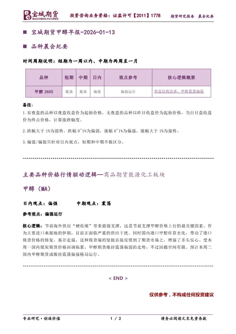 宝城期货-甲醇周报:偏多因素支撑,甲醇震荡走强-260109